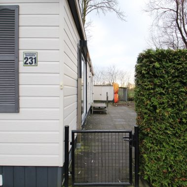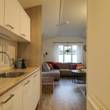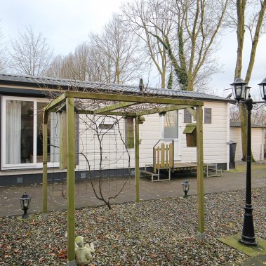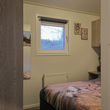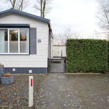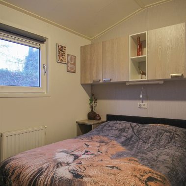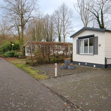 Modern vrijstaand chalet met twee (slaap)kamers, eigen parkeerplaatsen, rustig en vrij gelegen in het 50+ gedeelte van het park.