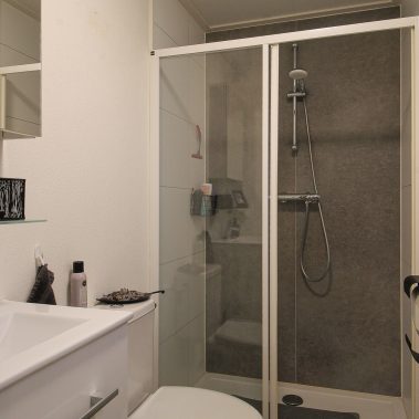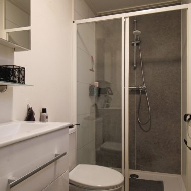 Ouderslaapkamer, een kleinere slaap- /werkkamer en badkamer met wastafel in meubel, toilet en douche.