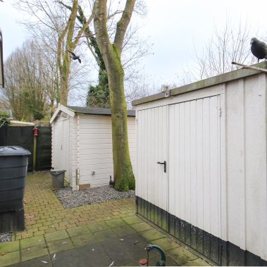 Tuin rondom met veel groen, terras, prieel, vrijstaande schuur als berging en een tweede vrijstaande schuur met witgoedaansluitingen.